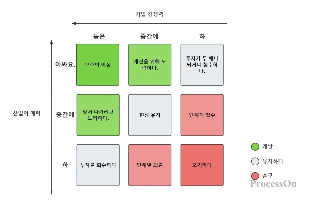 가로축은 기업의 경쟁력(강함/중간/약함)을 나타내고, 세로축은 시장 매력도(높음/중간/낮음)를 나타냅니다. 각 시장 부문은 9개의 칸으로 나뉩니다.