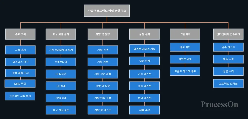 ProcessOn 템플릿 커뮤니티는 참고할 만한 풍부한 WBS(작업 분해 구조) 템플릿 과 예시를 제공하며, 더 쉬운 도면 작성을 위해 복사 기능도 지원합니다. 아래는 공유된 템플릿 중 일부입니다.