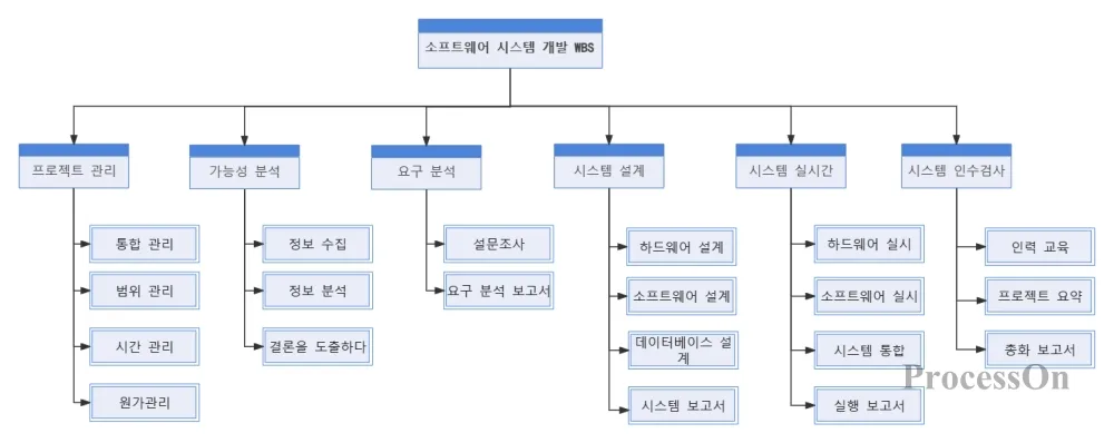 명확한 계층 구조: 일반적으로 최소한 "작업 패키지" 수준(즉, 담당자에게 할당될 수 있고 시간과 비용을 추정할 수 있는 가장 작은 단위)까지 세분화되어야 합니다.