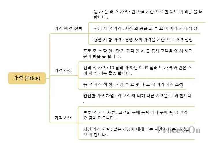 경쟁 기반 가격 책정: 경쟁사 가격을 참고하는 전략입니다. 저가 침투 전략, 고가 스키밍 전략, 또는 경쟁사의 가격 행보를 따르는 전략 등이 포함될 수 있습니다.