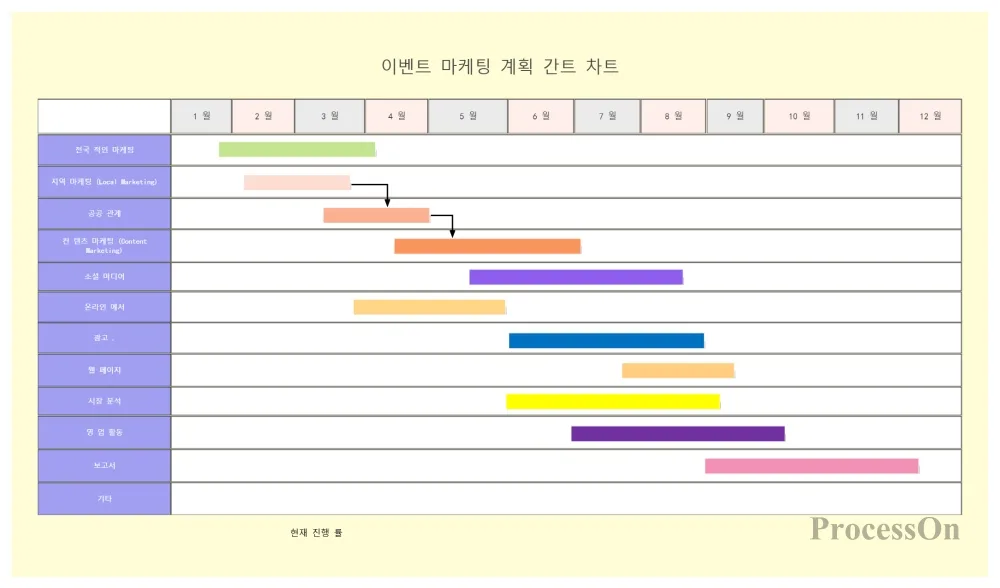 통합 마케팅 커뮤니케이션: 다양한 채널과 단계에 걸쳐 일관되고 상호 보완적인 홍보 메시지를 전달하는 것을 목표로 합니다. 간트 차트를 활용하면 연간 홍보 활동 일정을 계획하고 내부 자원 충돌을 방지할 수 있습니다.