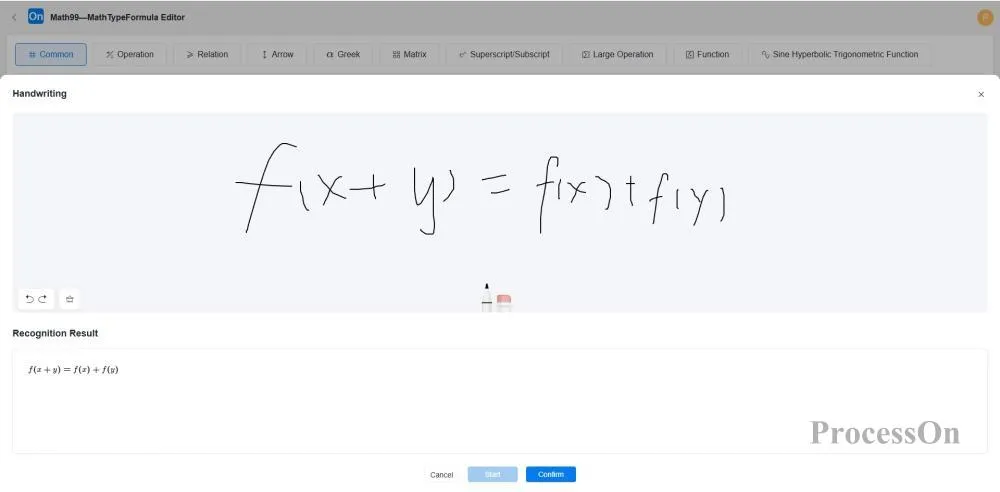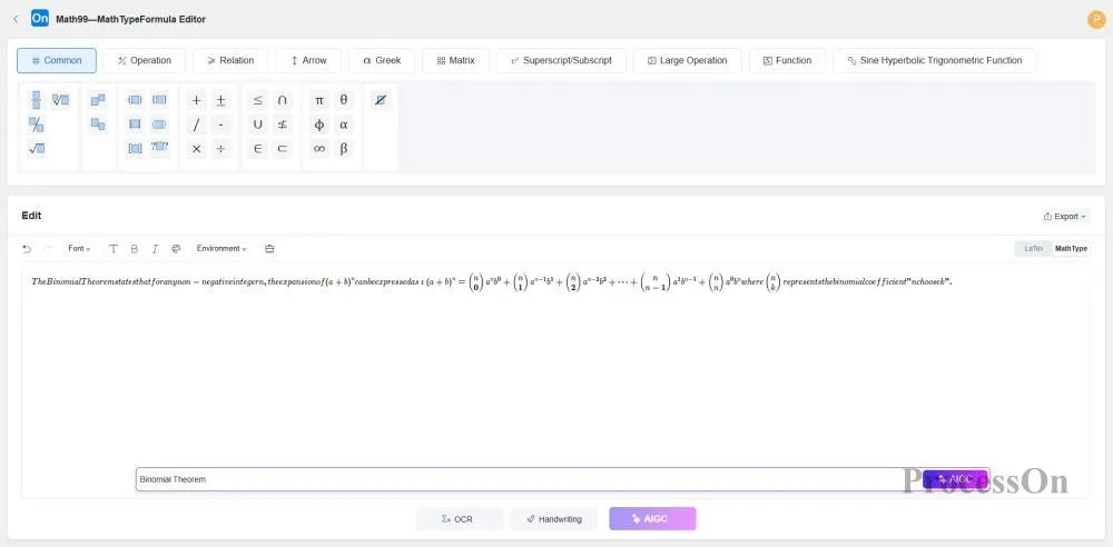 Com a crescente procura de edição de fórmulas na investigação académica e na educação, muitas plataformas lançaram ferramentas que suportam a entrada de fórmulas. Como plataforma líder de colaboração online, a ProcessOn lançou o seu poderoso editor de fórmulas online Math99 MathType, fornecendo aos utilizadores uma solução de edição de fórmulas matemáticas simples, eficiente e integrada. Seja para o ensino diário, investigação académica ou criação de conteúdos, o editor de fórmulas Math99 MathType pode ajudá-lo a inserir fórmulas complexas facilmente e a melhorar a eficiência do trabalho e dos estudos.