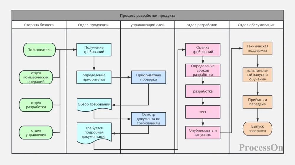 ProcessOn может добавлять пулы и дорожки для рисования. Независимо от сферы деятельности кросс-функциональные блок-схемы в основном выглядят одинаково, поэтому пользователи могут применить шаблон одним щелчком мыши.
