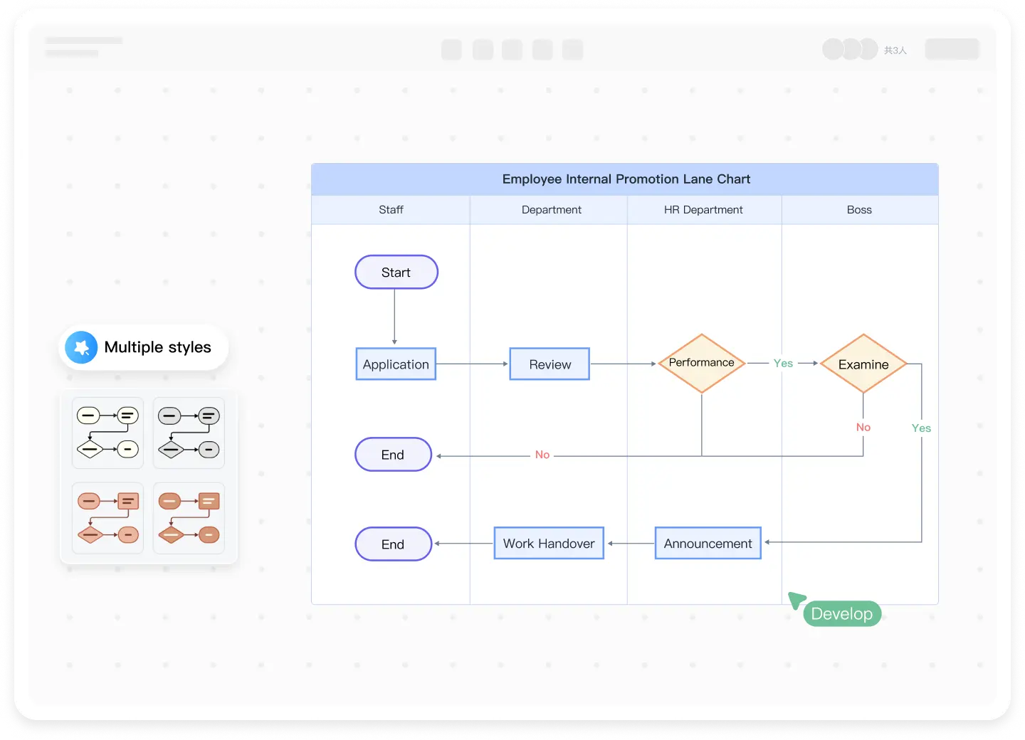 Drag and drop graphics according to the Flowchart drawing method to create the process, and ensure that each step of the process corresponds to the department and stage