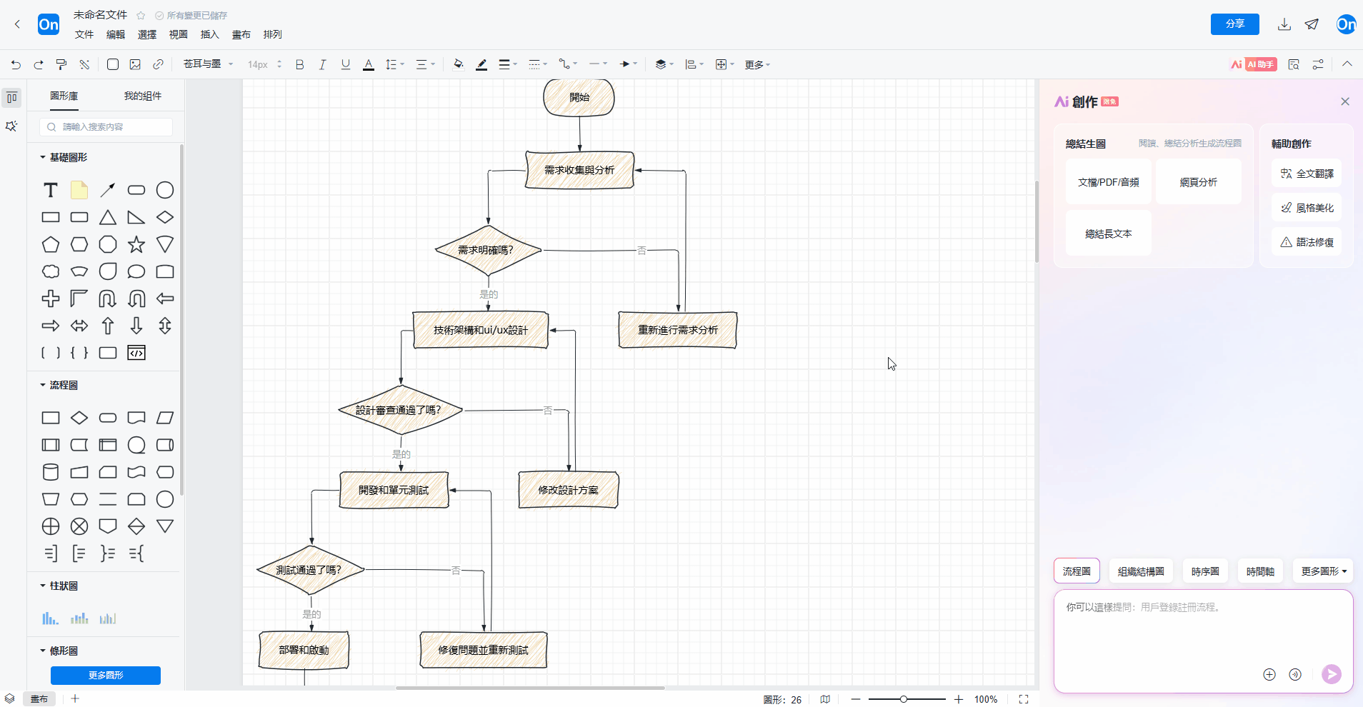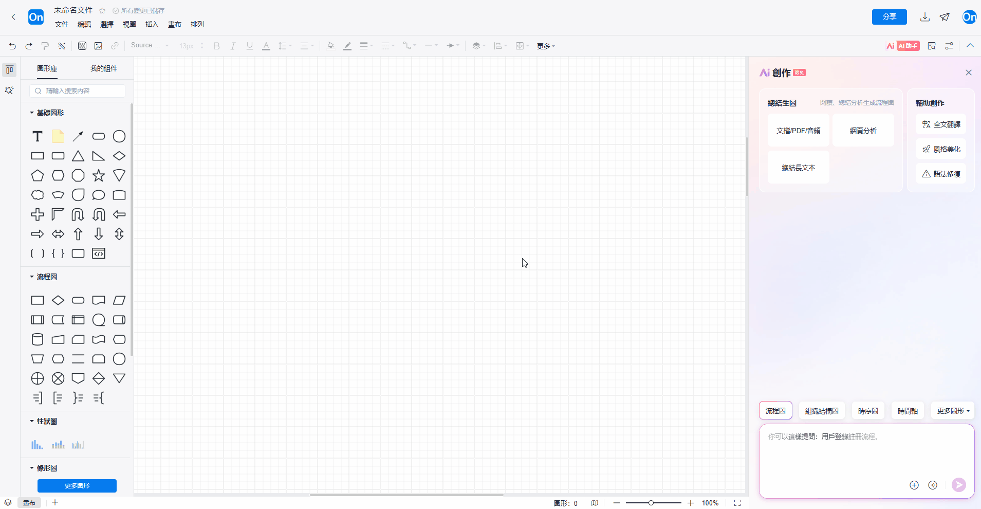 1. 在工作中,我們經常需要從各種來源獲取信息,並將其整理成結構化的流程圖。從長篇文件、會議錄音或網頁中擷取關鍵流程步驟,手動整理耗時且容易遺漏。可以使用AI功能辨識文字內容後總結分析產生可編輯的流程圖。