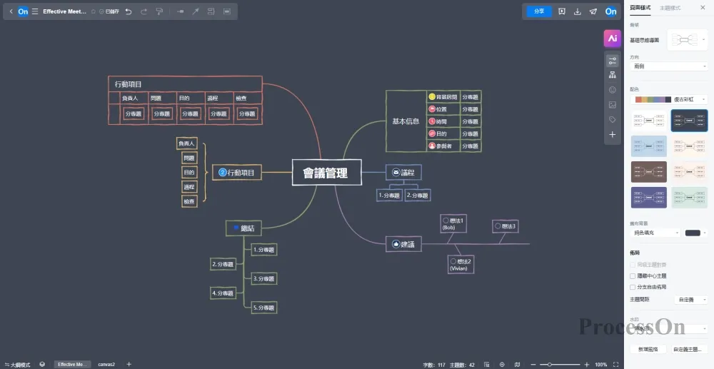 文字生成心智圖:輸入主題或需求(如「制定社群媒體推廣方案」),AI自動產生包含主分支與子節點的完整心智圖。