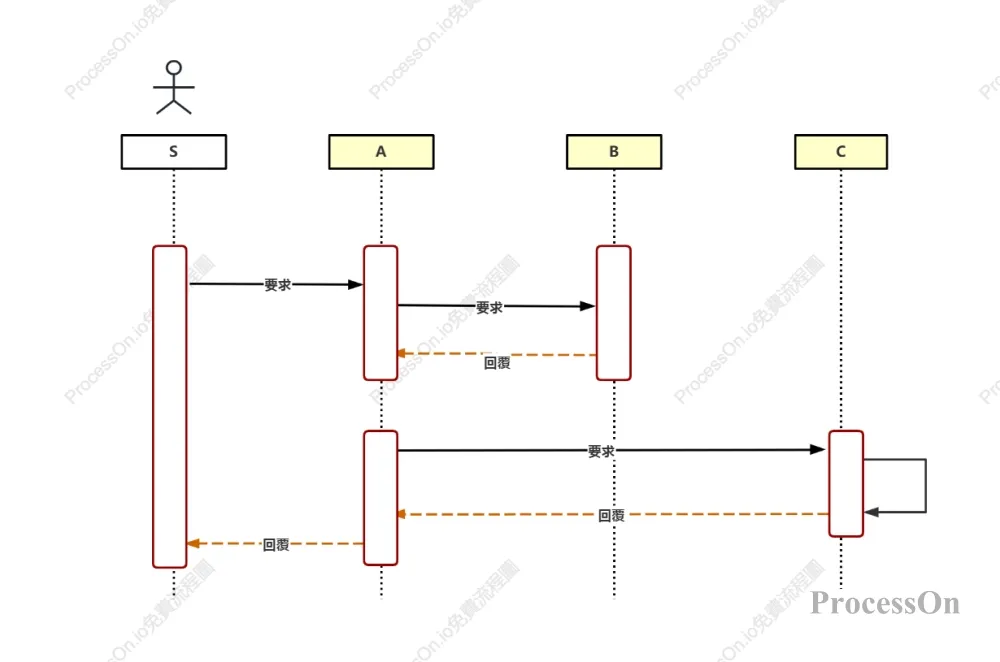 同步訊息(實線箭頭):發送後需要等待返回(如API呼叫)