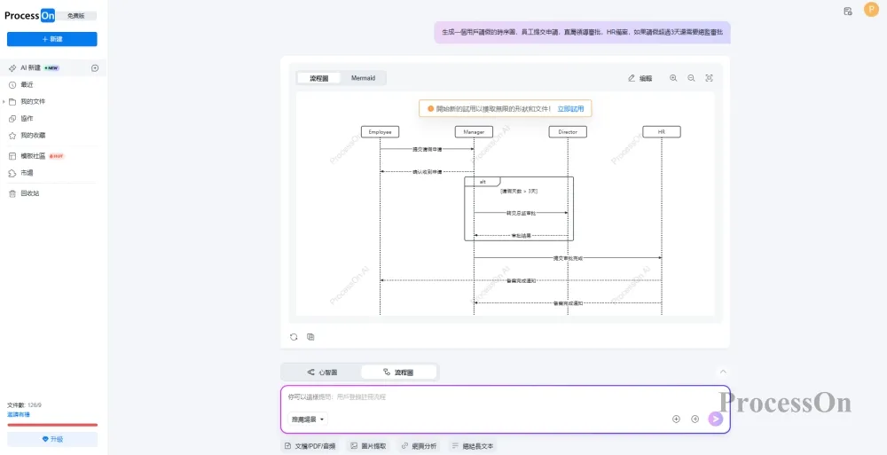 但現在不一樣了。 ProcessOn AI最近升級了時序圖產生能力,直接輸入需求,AI秒出專業級時序圖,徹底把畫圖這件事變成了「動嘴就行」。