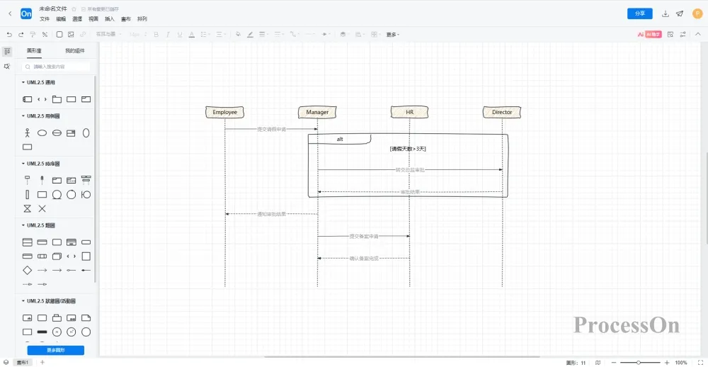 這張由AI產生的請假流程圖時序圖,業務邏輯嚴謹完整,無邏輯漏洞,比較貼合我們真實工作中的請假流程,既清晰展示了請假審批從發起到結束的全部交互順序和分支邏輯,又嚴格遵循UML的繪製規範,語法專業準確,是一份可以直接落地的高質量交付物。