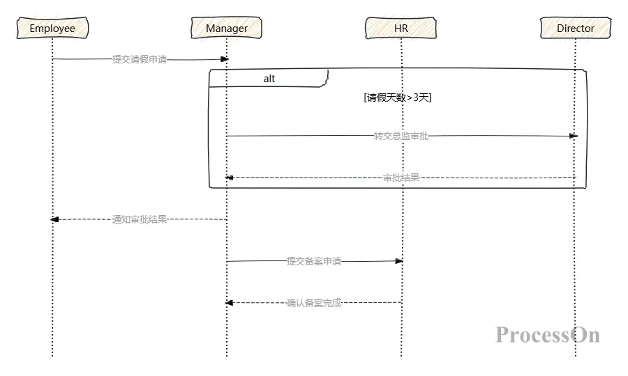 「產生一個用戶請假的時序圖,員工提交申請,直屬領導審批,HR備案,如果請假超過3天還需要總監審批」。