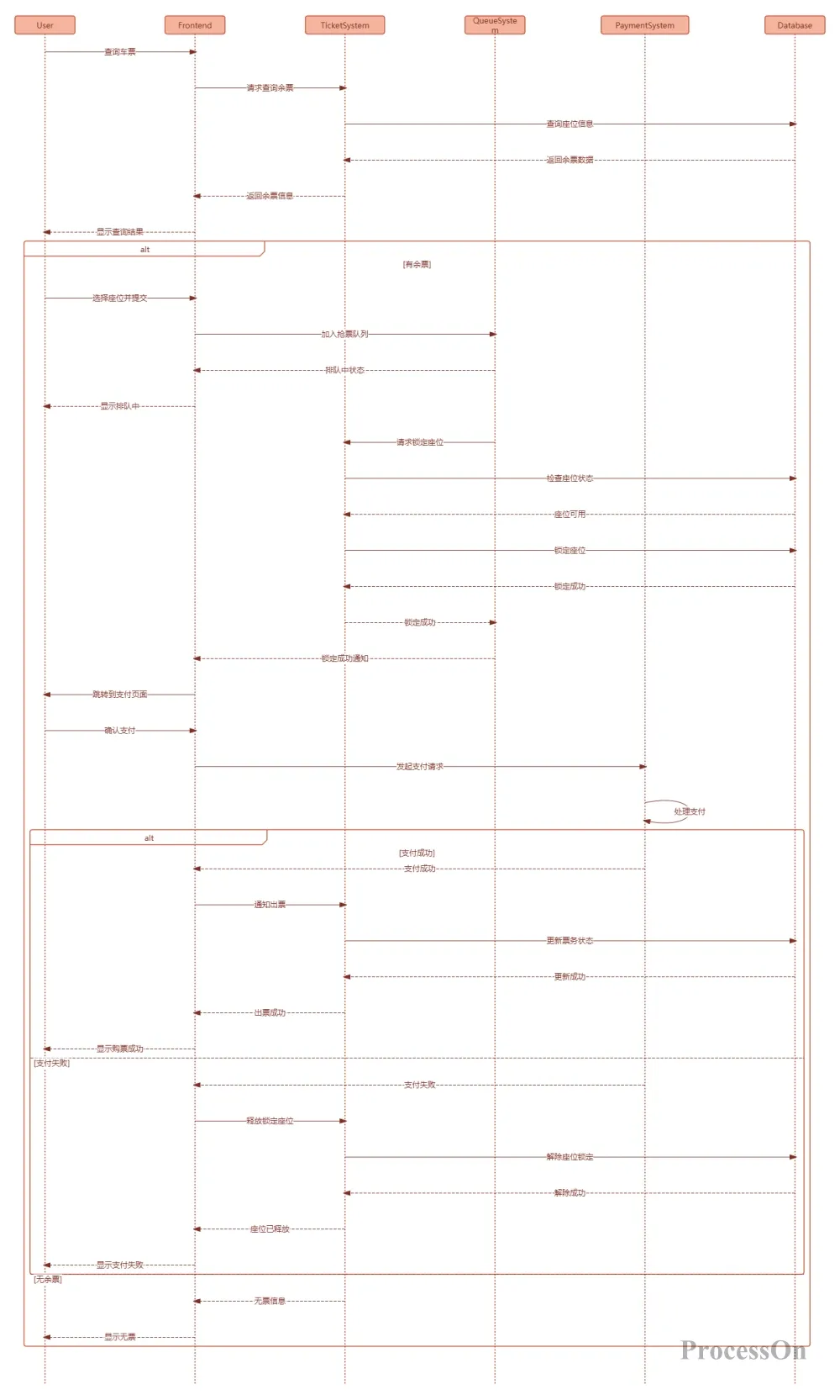 「產生一個搶火車票的時序圖,包含用戶、前端、票務系統、支付系統、資料庫、排隊系統,要體現查票、鎖座、支付、出票的全流程,還要處理無票和支付失敗的異常情況」