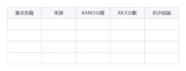 你可以用表格或心智圖來整理最終的需求清單。一個清晰的需求梳理表應該包含:需求名稱、來源、KANO分類、RICE分數、初步結論。