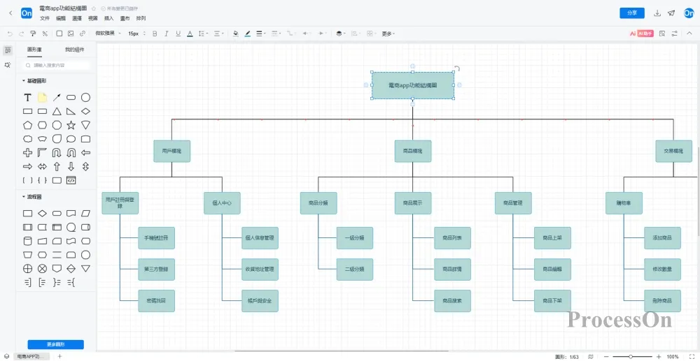 在ProcessOn中,可以直接用「流程圖」或「組織結構圖」範本來畫出功能結構圖。