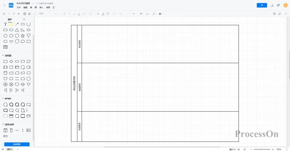 1. 登入ProcessOn後,進入個人檔案頁,點選「新建檔案」→選擇「流程圖」。然後在更多圖形中加入BPMN到圖形庫,如果需要繪製泳池泳道,也可以將泳池/泳道圖表類型新增至圖形庫。