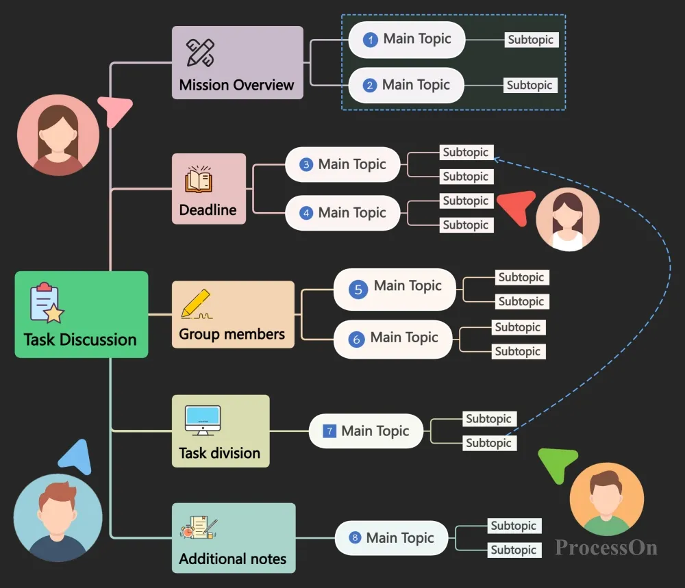 為了滿足這些原則,我們需要一個真正能同步協作、能呈現結構、能集中所有資料的工具。 ProcessOn 就是這樣一款線上協作平台,它本身就是全球使用者都在使用的圖形化協作工具,非常適合學生小組作業。