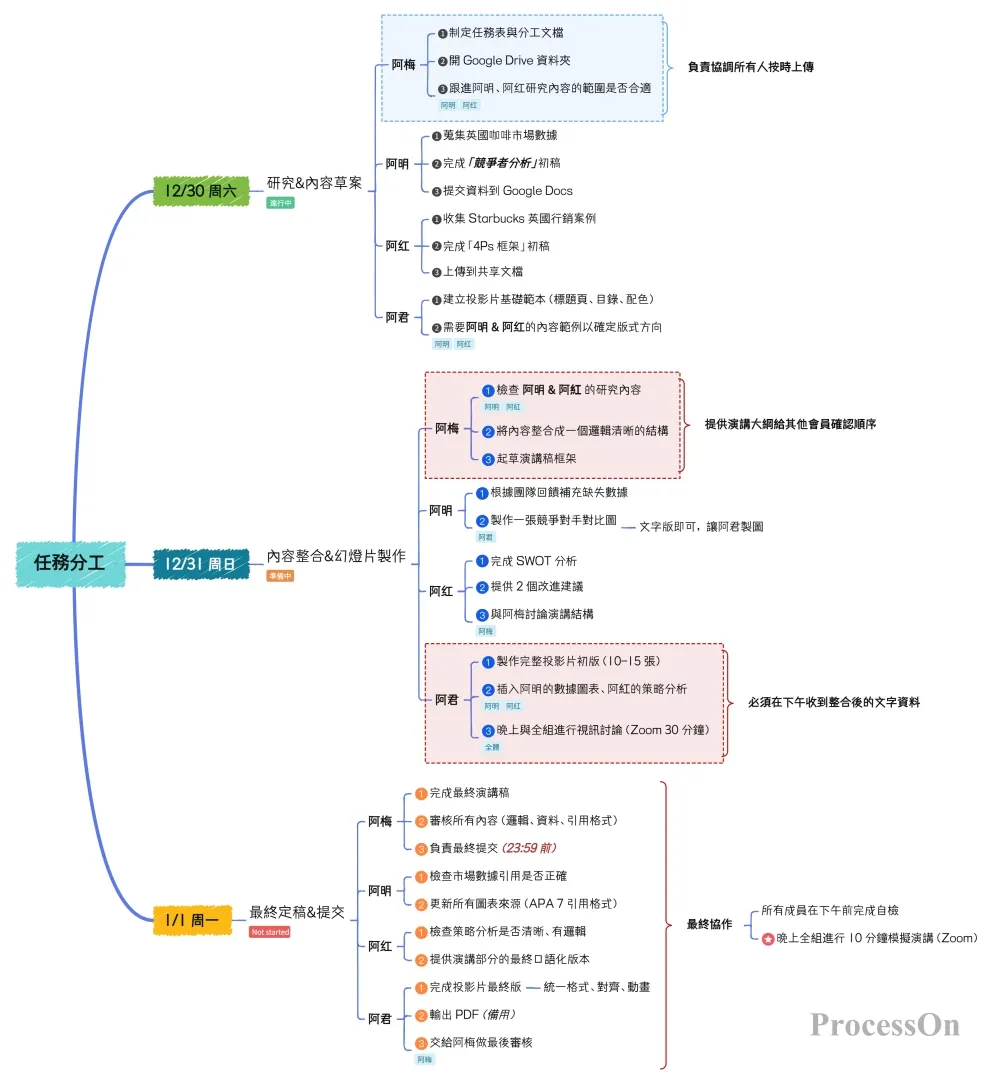 利用ProcessOn的心智圖功能進行任務拆解,可以是樹狀圖、組織結構圖或最基礎的心智圖等: