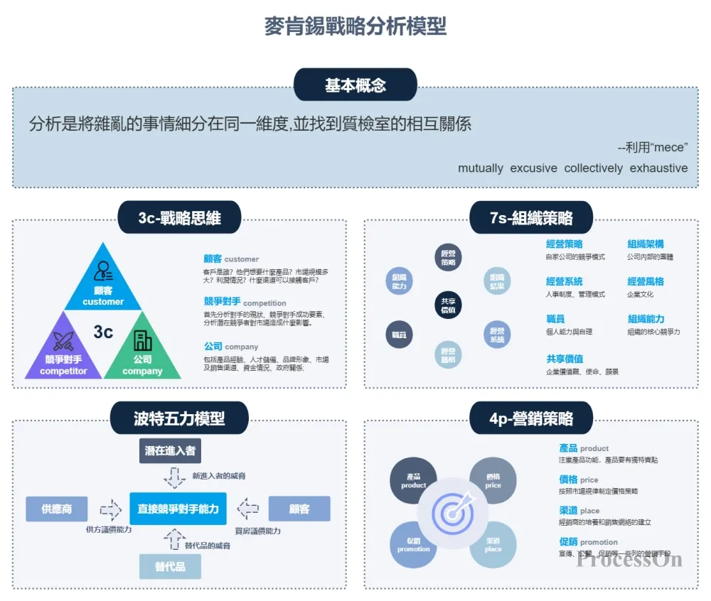 ProcessOn模板社群內建了PEST分析、波特五力模型、3C模型、4P模型等麥肯錫策略內的全套模型模板,你可以學習和使用。