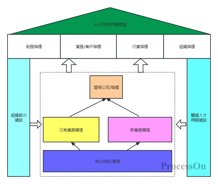 戰略屋模型是麥肯錫用於將策略視覺化的重要工具,它以房屋的結構形像地展示了企業策略的各個組成部分及其相互關係。屋頂代表企業的策略目標,通常包括財務指標、業務/客戶指標、行業指標和組織指標四個維度;房屋的中間部分是策略的核心,包括燈塔公司/指標、已有業務模組和新業務模組,這些模組是實現策略目標的核心載體;而房屋的地基則是核心技術/資源、組織能力建設和建築梯隊建設,它們為業務人才的發展提供,它們為業務人才的發展提供關鍵。