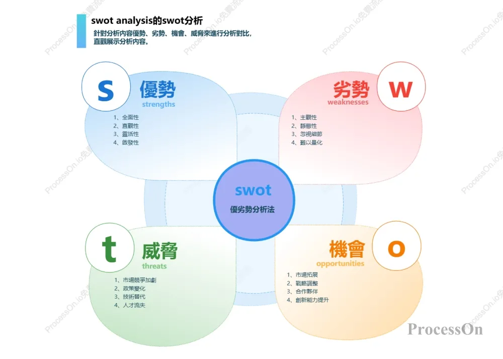 分析每個因素對企業的影響是正面(機會)還是負面(威脅)。例如: