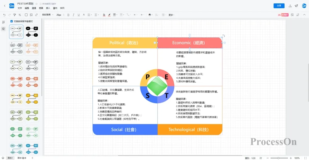 ProcessOn模板社群內有大量使用者發布的PEST模型模板,可以學習案例或使用模板。