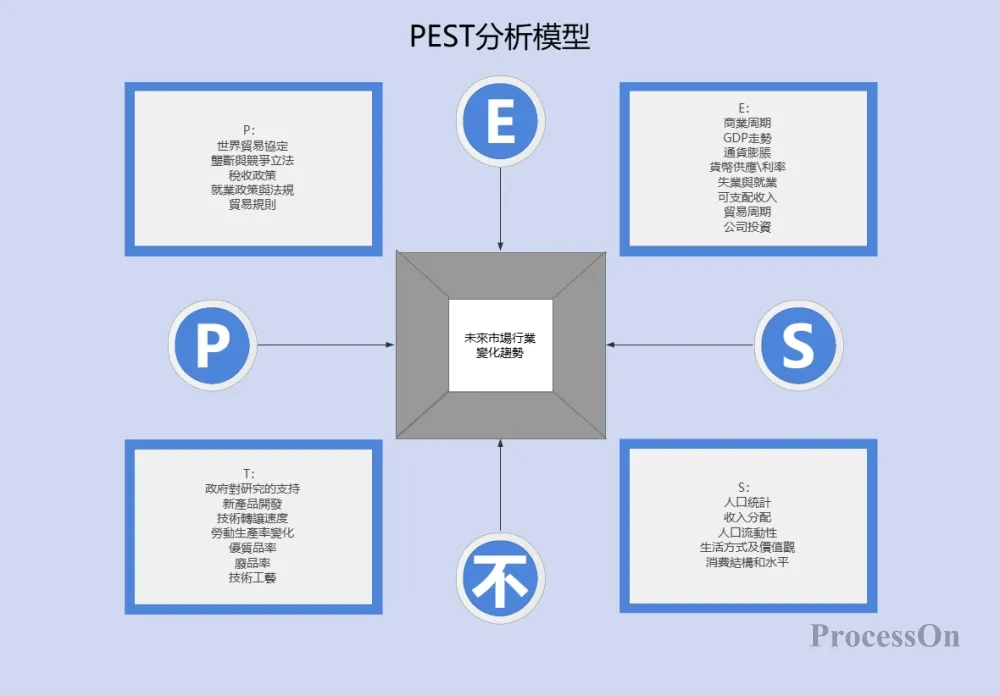 PEST模型是一種宏觀環境分析工具,用於評估外部環境中的四大關鍵因素對企業策略的影響。 PEST四個字母分別代表: