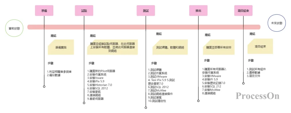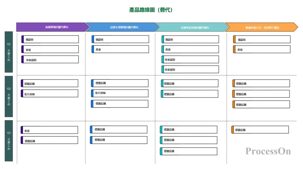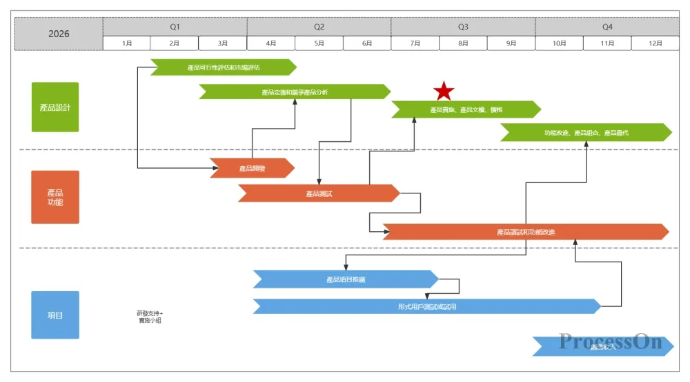 進入ProcessOn ,搜尋關鍵字[產品路線圖],使用模板,進入流程圖製作器後進行編輯。完善時間軸,產品功能,風險說明等模組。
