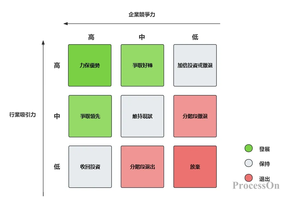 橫軸是企業競爭能力(強/中/弱),縱軸是市場吸引力(高/中/低)。將每個細分市場放入九個格子中: