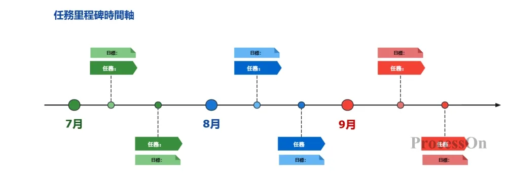 把時間節點畫在時間軸上,每個節點的完成情況可以用顏色標註(綠色已完成、黃色進行中、紅色延期)。這種視覺化方式比寫在文件裡更有衝擊力,團隊成員一眼就能看出節奏是否正常。