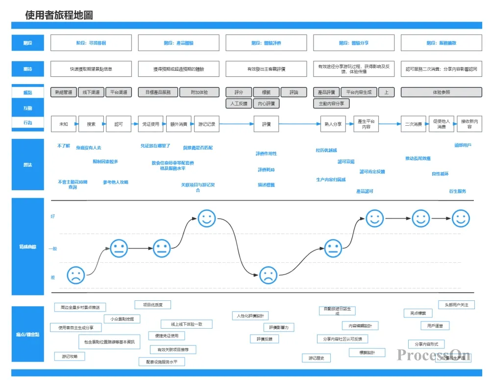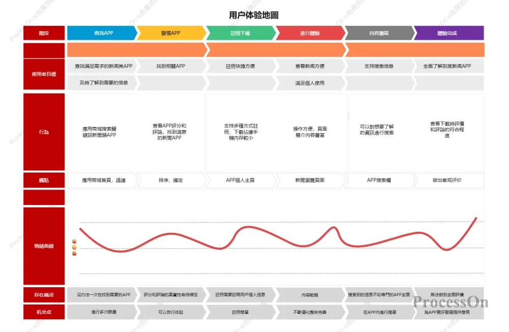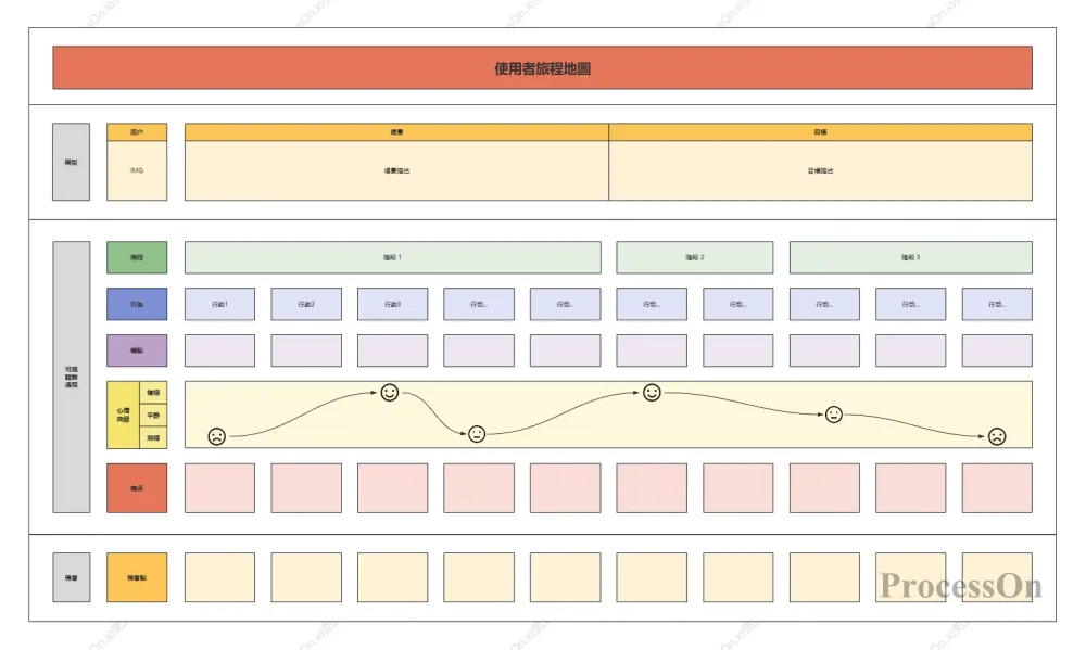 你可以把它理解為一張「使用者體驗地圖」——橫軸是時間,縱軸是使用者的行動、想法和情緒。透過這張圖,團隊可以直觀地看到:使用者在什麼時候、做了什麼、想了什麼、感受如何、遇到了什麼問題。