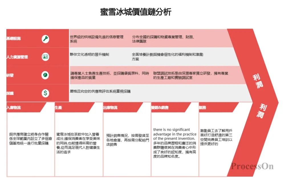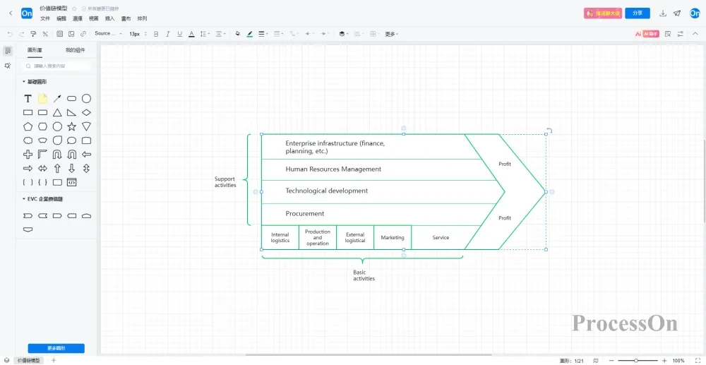 將企業的所有活動依照波特模型的九個類別進行歸集。你可以使用心智圖或流程圖工具,畫出從原料到售後服務的完整鏈條。在ProcessOn中,有現成的價值鏈模板,只需拖曳修改即可。