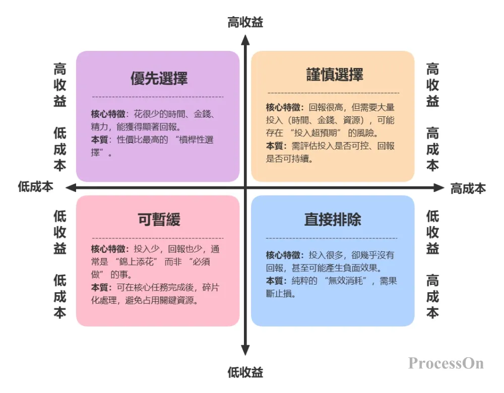 常用的分析工具是成本—價值矩陣。橫軸是成本高低,縱軸是收益貢獻高低,將活動放入四個像限: